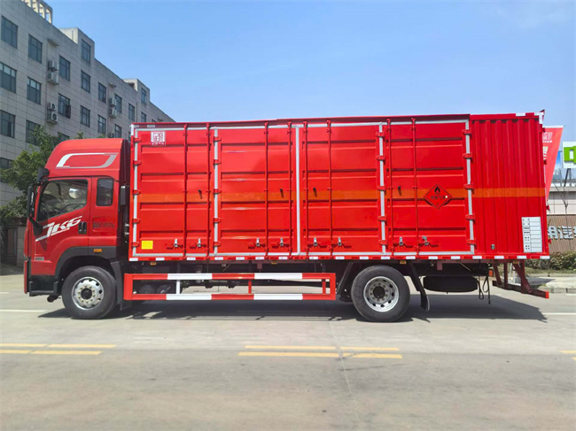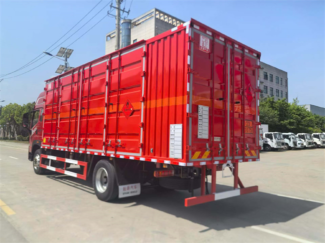 瓦楞板,左右两侧各两组双开门2.7米宽,靠前开.底板用5个厚花纹板朝上,边板用1.5个厚材料做,横梁副梁用高强钢,横梁间距250,车厢前墙板竖1.2米高5个厚护板,整车贴反光标示及警告标志(随车工具,灭火器,三角顶灯,危险品牌,拖地静电带),其他按照公告标准制作。
