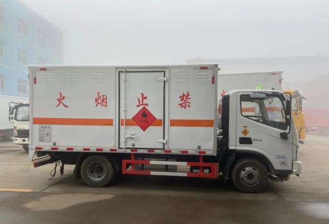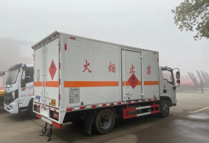 货厢尺寸严格按照公告尺寸制作,外板采用1mm厚冷轧板有一次性成型的百叶窗,内饰为导电性能良好的铝板有透气孔,内衬为矩形管骨架牢靠稳定,内部填充为透气防潮阻燃的挤塑板,四种材料经现代工艺复合而成,厢体外部上下铝合金型材包边,底板和车厢前下部铺橡胶皮,后门双开,右侧中部单开门,内部有固定货物的卧环,车辆外部有静电带、灭火器、防火罩,车厢内安装烟雾报警器和门防盗报警器,严格按照国家危险品相关法规张贴。