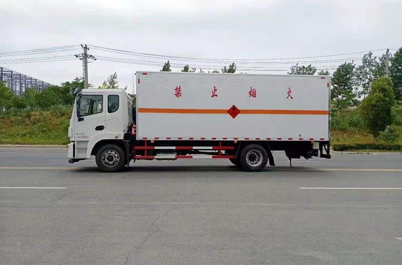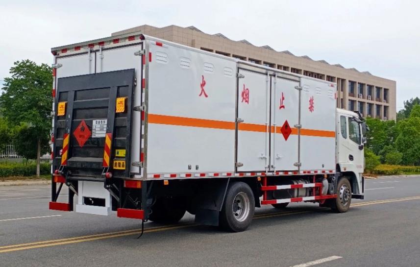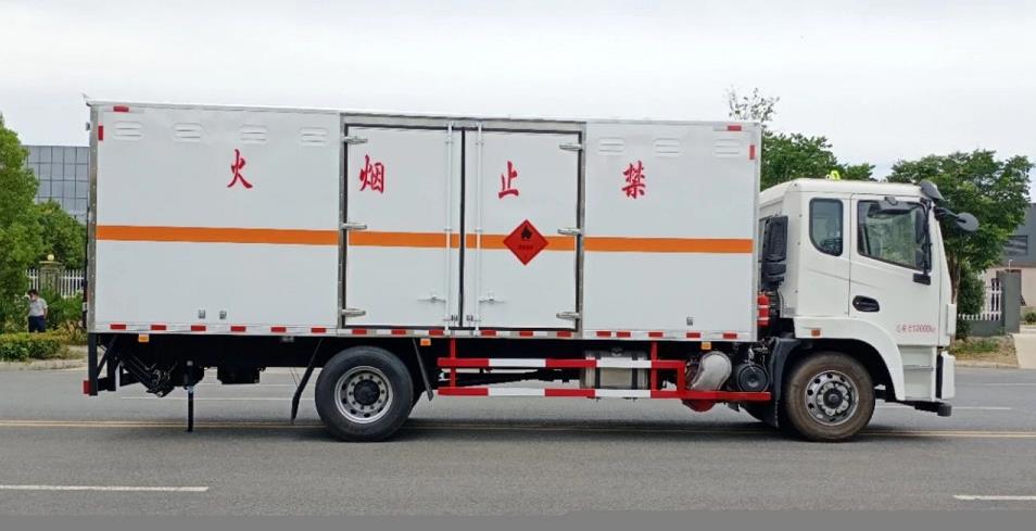 上装配置:厢体为双层金属骨架结构,外板冷轧板,中间填充阻燃泡沫,内壁采用铝合金蒙面,并用铝合金型材收边,门框采用不锈钢材质包边,镀锌合页、门杆、锁件,厢体两侧上部安装防雨通风透气孔。底板为花纹板,上铺防静电胶皮,厢体右侧中开单侧门。厢内两侧加装固定货物卧环,门框带防盗报警器,顶部带烟雾报警器,防撞块。配备随车工具,灭火器,三角顶灯,防火帽,防静电拖带,贴反光标识等。