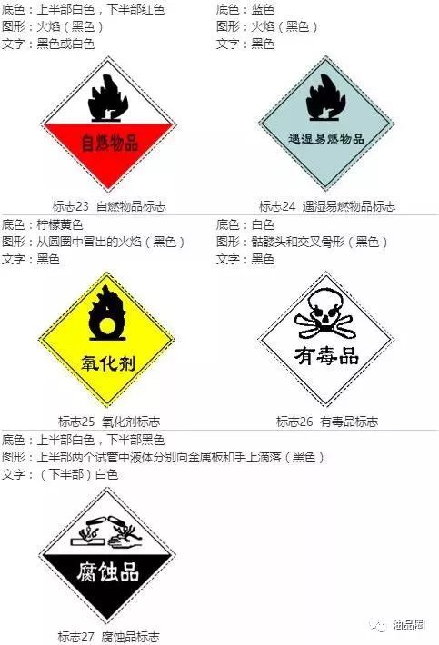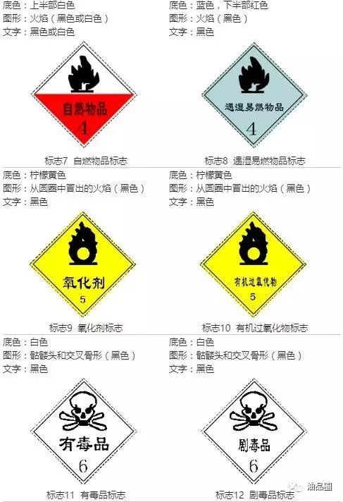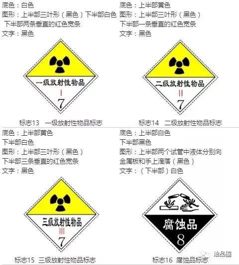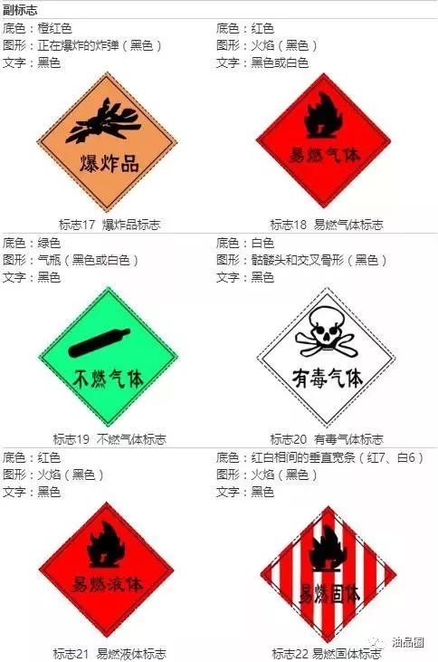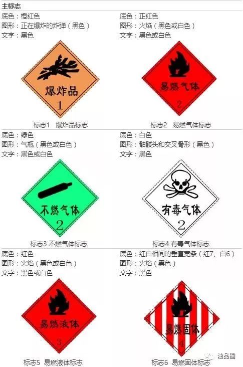 标志的图形:主标志由表示危险特性的图案、文字说明、底色和危险品类别号四个部分组成的菱形标志。副标志图形中没有危险品类别号。