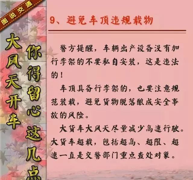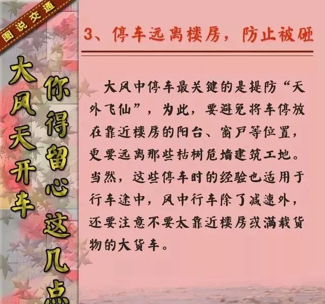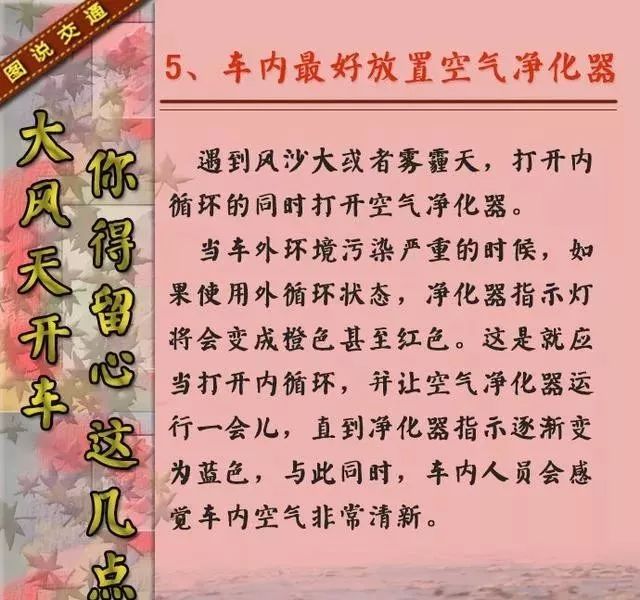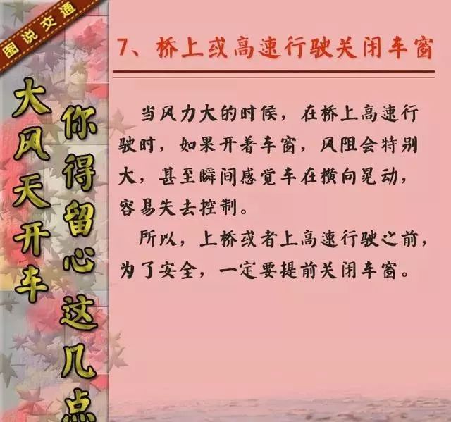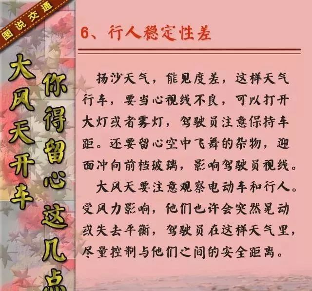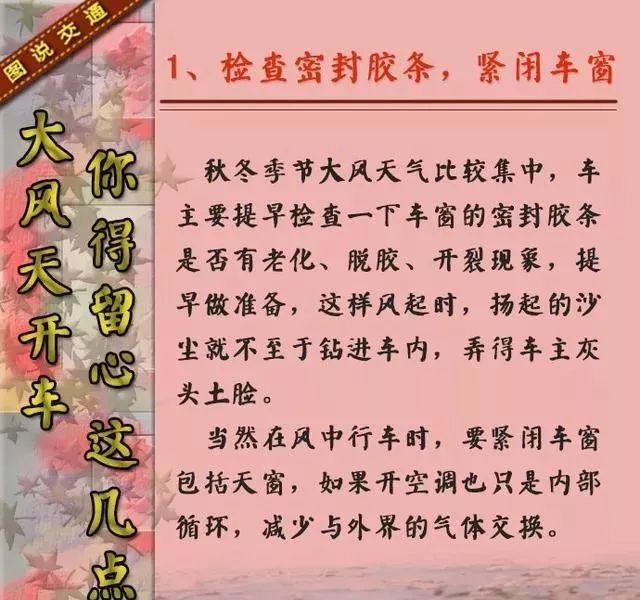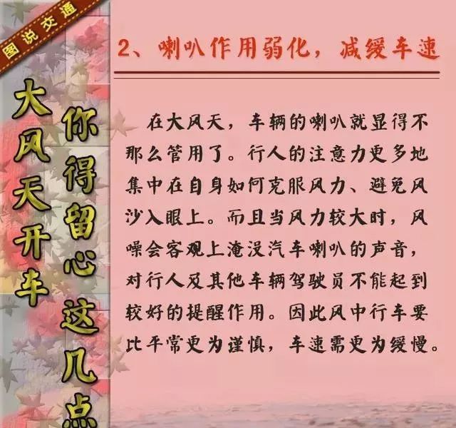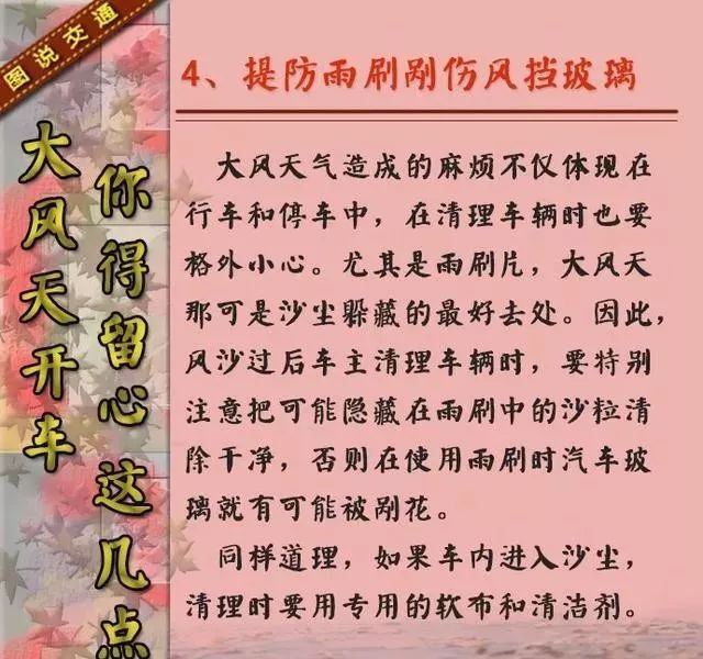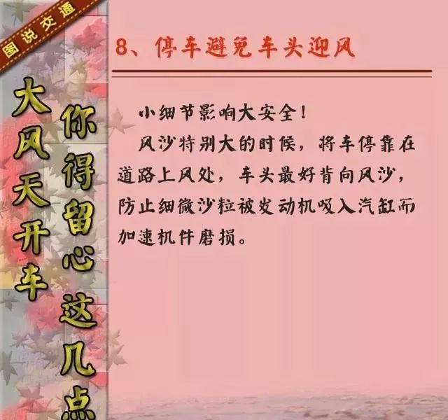 在大风天气中行车,由于风力的作用,车辆行驶稳定性下降,同时飞扬的尘土也会遮挡视线,影响驾驶员的正常观察和判断,这时候就会使制动停车距离相对增长,制动非安全区增大。如果风力过大,还容易使车辆侧滑或侧翻。提醒司机朋友,大风天气慎重开车,安全第一!
