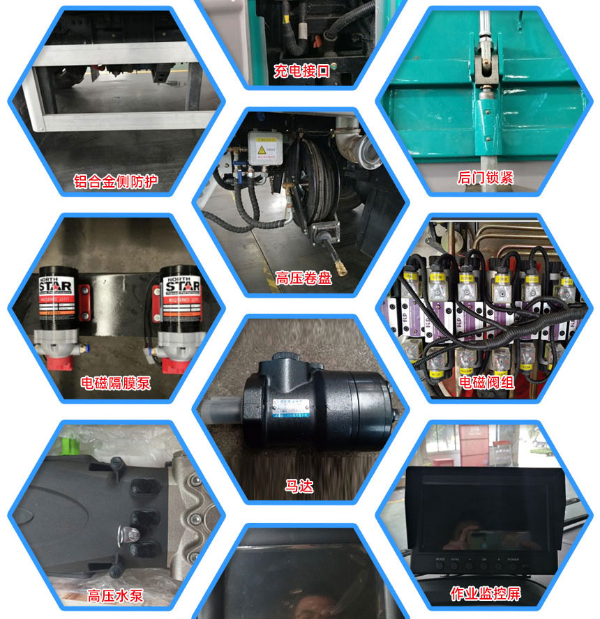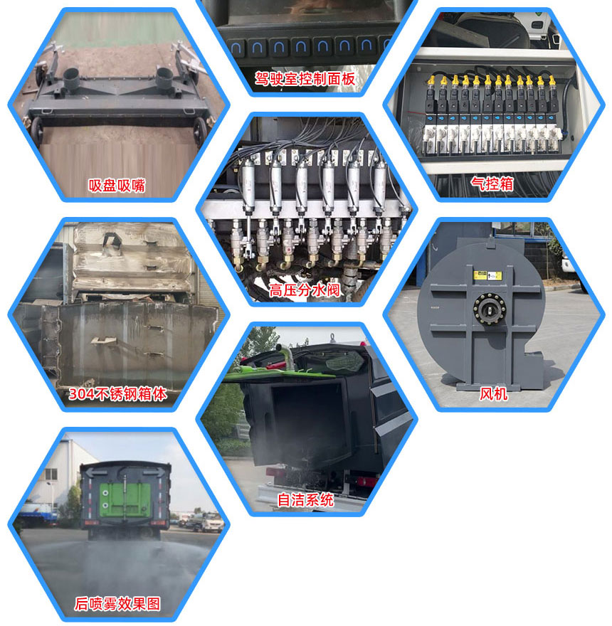 6、左右喷水杆安装在吸盘上,随吸盘升降,结构简单紧凑,保证喷水杆的离地高度固定不变,达到最佳清洗效果。开放式液压系统驱动左右立扫升降、左右扫盘旋转、吸嘴升降、垃圾箱后门开闭、垃圾箱倾翻复位等机械动作。