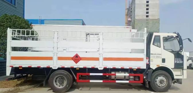 仓栏式气瓶运输车,厢体采用顶部不封闭,侧板仓栅式的厢式车结构,外饰冷轧钢板,厢体两侧分为两段活动式结构可左右翻转,该车厢整体可适用于各种气罐、气瓶直立运输,煤气罐两层运输,底板边缘间断式焊接固定卧环,方便固定捆绑气瓶,操作方便。