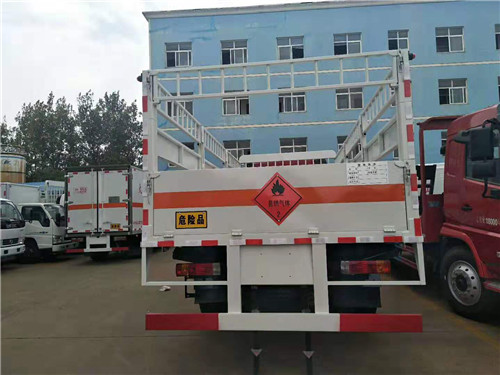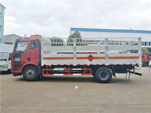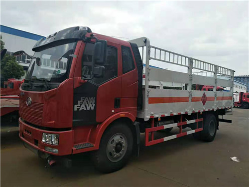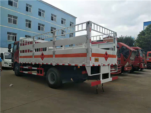 该车适用于运输危险品为危险货物运输车,用于运输具有独立容器(瓶)包装的易燃气体(类项号:2.1):液化石油气,压缩甲烷或甲烷含量高的压缩天然气,乙炔,乙烷,丁烷,丙烯,丁烯,二甲醚,压缩氧。发动机CA4DK1-18E51,CA4DK1-22E51分别对应的油耗值为:27.42,27.42。当整车长度为8500mm时,轴距4700mm,5000mm,5300mm与后悬2400mm,2100mm,1800mm一一对应。当整车长度为8680mm时,轴距5600mm与后悬1680mm一一对应。侧防护和后防护装置材料材质为Q235A碳钢,侧防护与箱体底部焊接连接,后防护装置与车架采用焊接连接。后防护截面尺寸(mm):145×40,离地高度为540mm。仅采用底盘子午线轮胎和带ABS的底盘,该车前轮安装盘式制动器,前置排气管,装配限速装置,限速79km/h。安装带有卫星定位功能的行驶记录仪。专用装置为固定用卡槽。ABS系统生产厂家:长春科密汽车制动有限公司,型号:CM4XL。选装无栅栏,选装后部液压尾板。后部液压尾板收起状态长度是250mm。 |