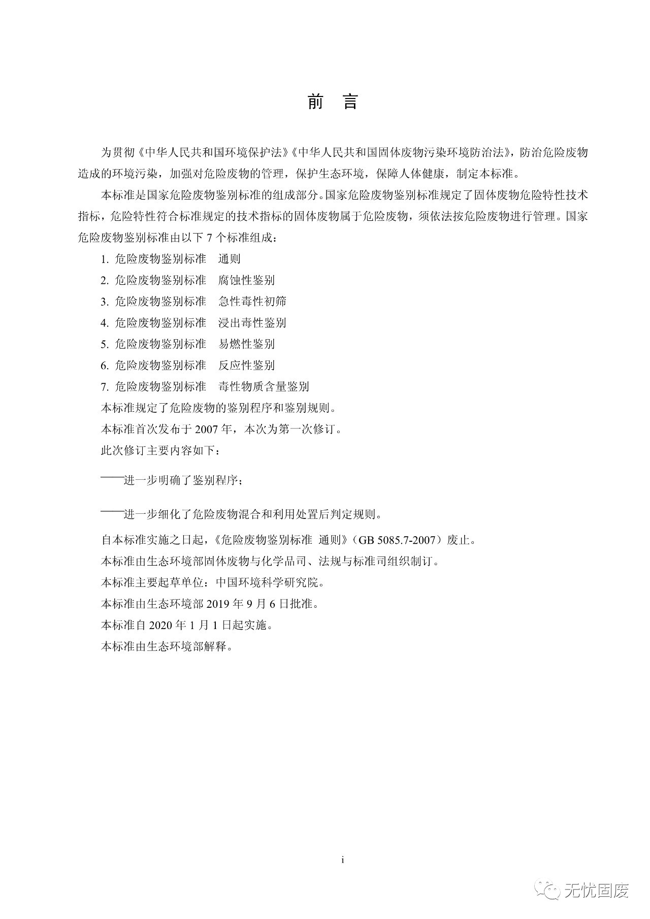 以上标准自2020年1月1日起实施,自实施之日起,《危险废物鉴别标准 通则》(GB 5085.7-2007)废止。