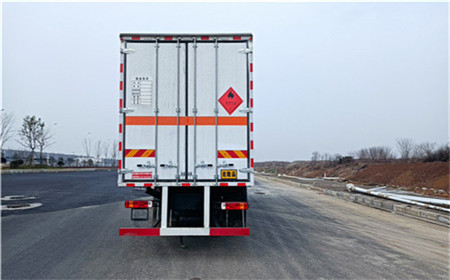 外板采用免漆板及一次性冲压成型具有防雨功能的通风窗,货厢内蒙皮采用合金板有透气孔,复合加铆合工艺,内衬为矩形管骨架牢靠稳定,货厢面板内外蒙皮之间采用阻燃隔热材料填充,厢体外部四周铝合金型材包边,底板和车厢前下部铺橡胶皮,后门双开,可选开侧门,内部装固定货物的卧环或护板,安装烟雾报警器、防盗感应器。车身附件静电接地带、灭火器、防火罩、危险品三角灯、橙色反光带、反光板、菱形标志牌、危险品牌、安全告示齐全。